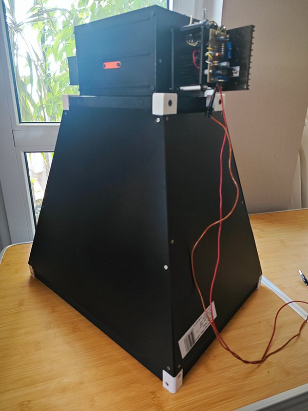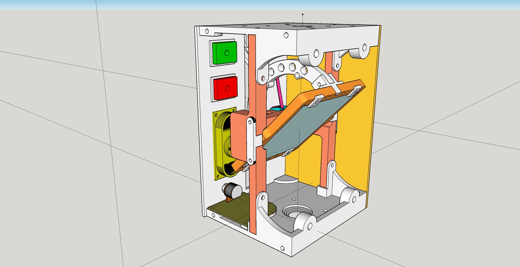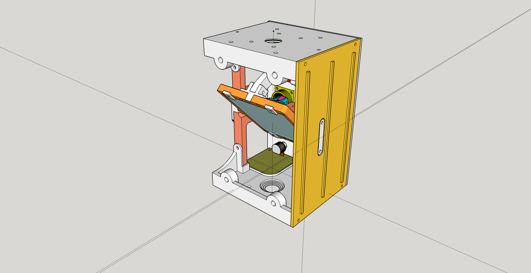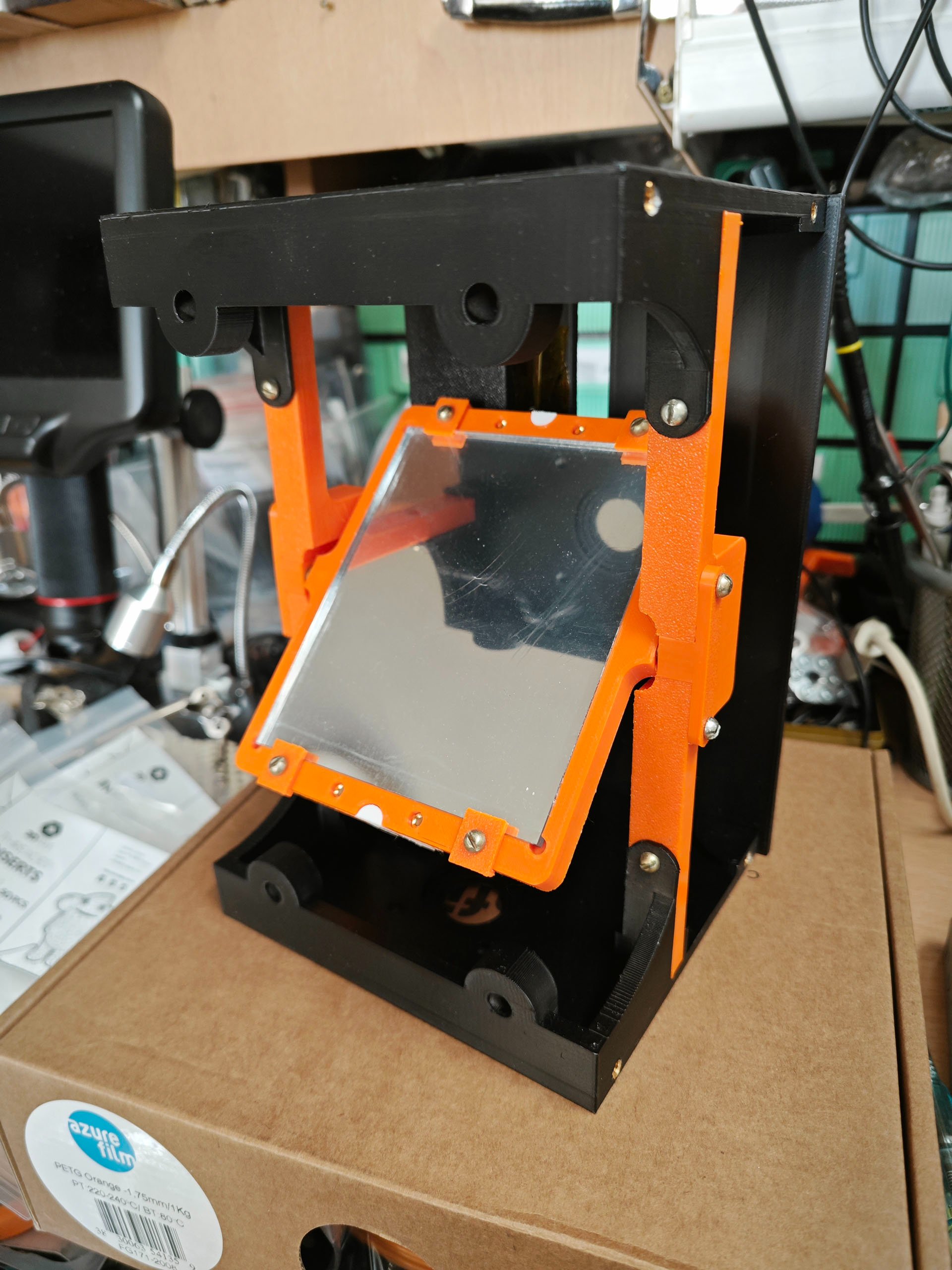Има известен напредък по проект "Говорещо фенерче 2.0" Почти е готов огледално-рефлексния механизъм. Геометрията е вярна. Всичко се печата на 3D принтер, след това се покрива с боя - черен мат за да няма нежелани бликове и отражения. Крайните положения на огледалото са осигурени с магнити.