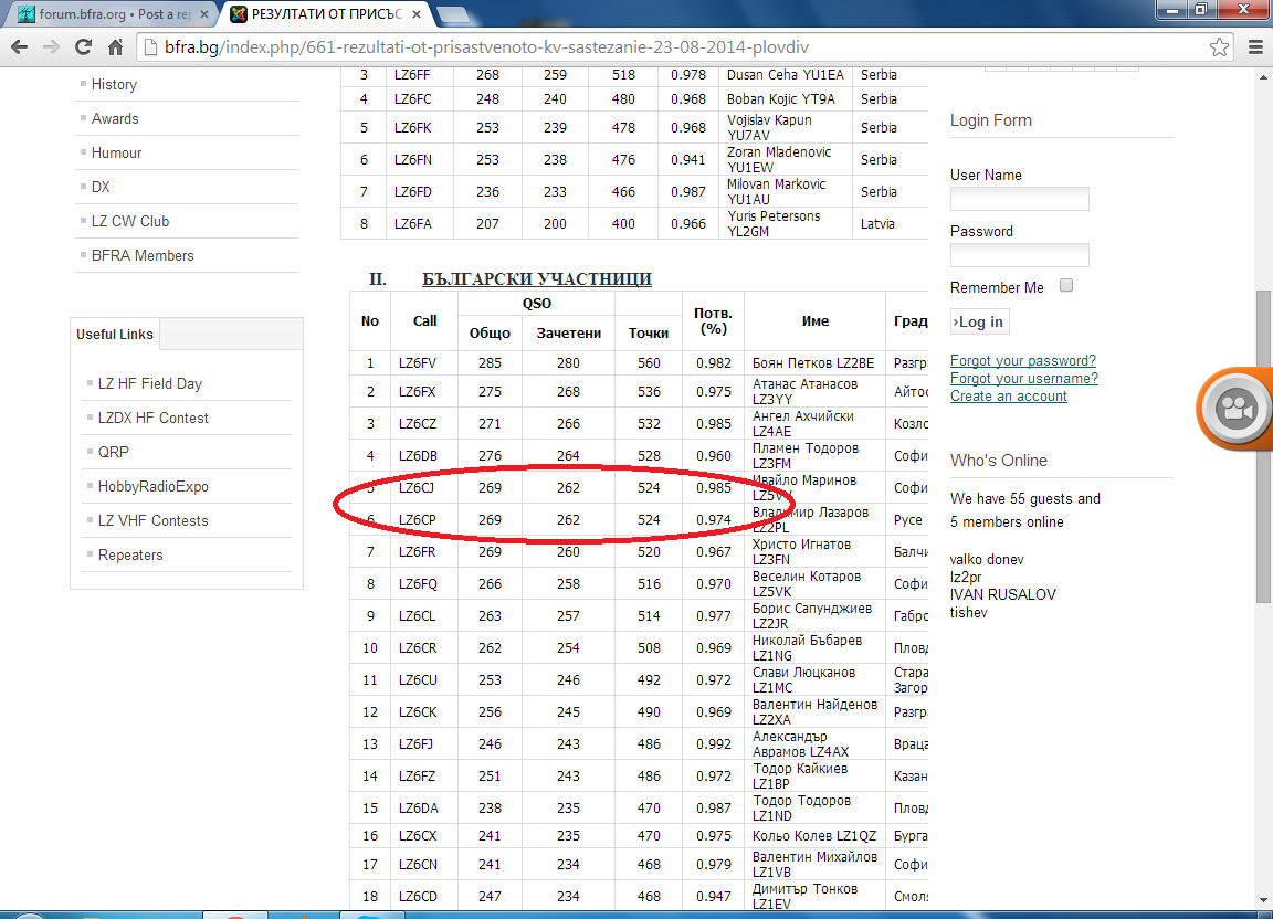 Благодаря на LZ2LDS за забелязаната техническа грешка в процентите и за класирането на LZ5VV и LZ2PL.LZ2LDS написа:Бойчо,BFRA написа: РЕЗУЛТАТИ ОТ ПРИСЪСТВЕНОТО КВ СЪСТЕЗАНИЕ, 23.08.2014 - ПЛОВДИВ