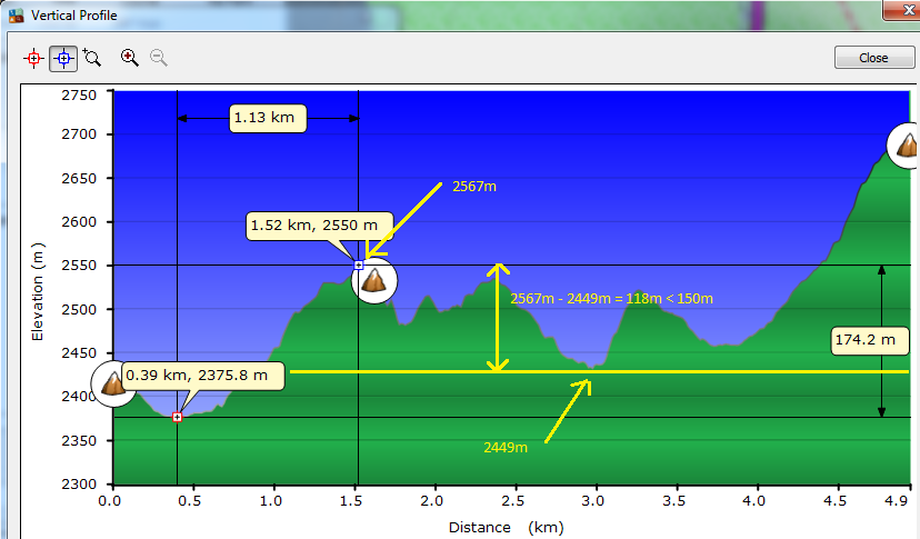 Ще дам конкретен пример с връх Мечит (2567м). Неговата ключова седловина, свързваща го с по-високия Лопушки връх, е с височина 2449м и се намира на N42.18799 E23.45296. В този случай "Prominence" = 2567-2449 = 118м < 150м минимум. Следователно връх Мечит не отговаря на критерия за включване в SOTA.