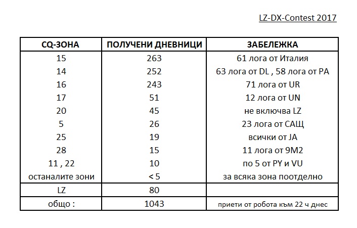 за мен LZDXC-2016 е най-лошо отчетеното издание от години насам - нито връзките в сайта са изпипани, нито статистиката и публикуването на логовете, за което има решение на УС, стана факт. дали са наградени първенците ? - не зная. мен за сега, никой ме не е търсил за спонсорство на плаки (което, разбира се, не е задължително).