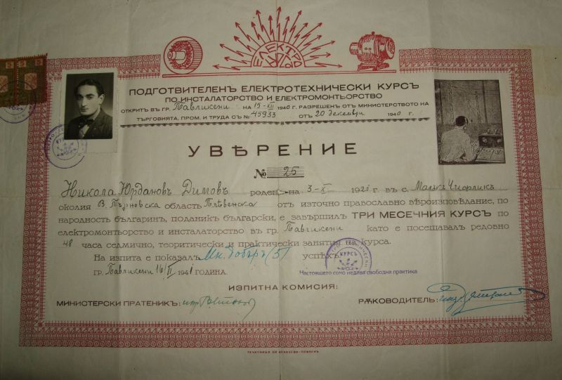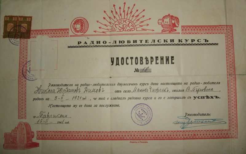 Днес добавих в колекцията два интересни документа. Те представляват "Удостоверение за завършен радиолюбителски курс" и "Уверение за завършен курс по електромонтьорство и инсталаторство" и са издадени на едни и същи човек по едно и също време.