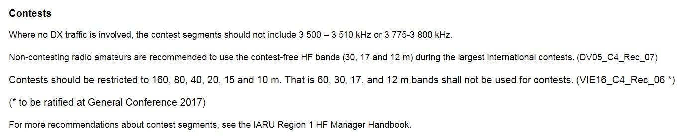 и тъй като следва уважението да е взаимно, IARU препоръчва на всички станции, НЕучастващи в най-големите контести, да използват по възможност WARC бандовете. Иначе казано "молим активациите, да изчакат до края на контестите !"
