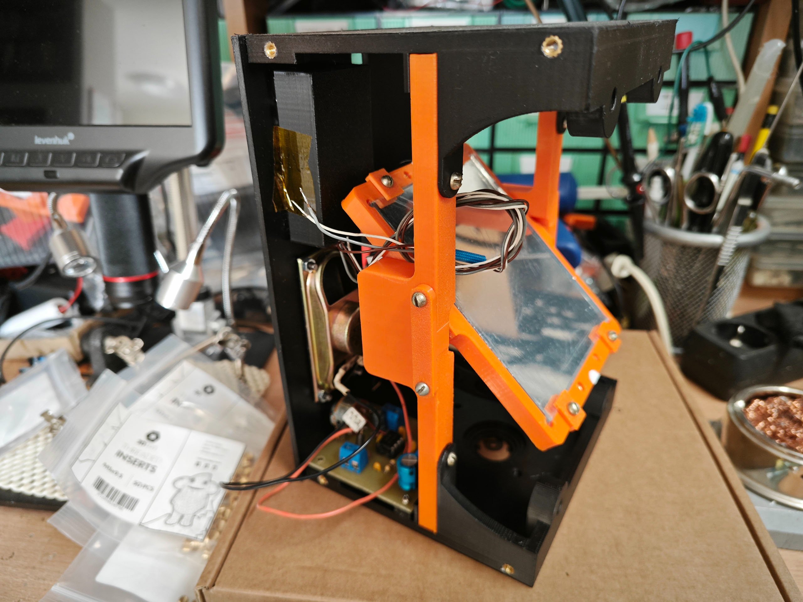Има известен напредък по проект "Говорещо фенерче 2.0" Почти е готов огледално-рефлексния механизъм. Геометрията е вярна. Всичко се печата на 3D принтер, след това се покрива с боя - черен мат за да няма нежелани бликове и отражения. Крайните положения на огледалото са осигурени с магнити.