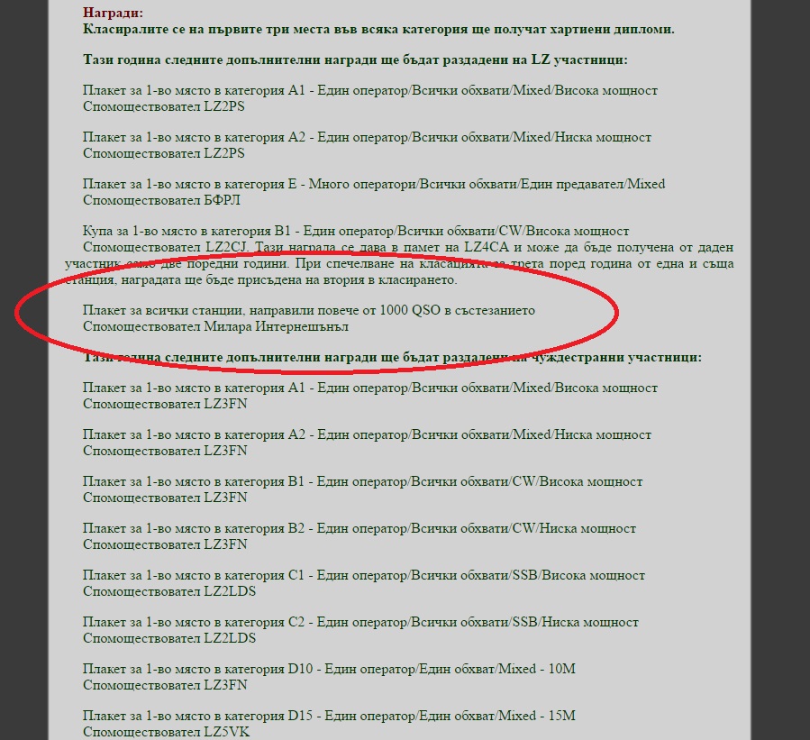малко късно се включвам и не мога да разбера защо те тормози факта , че всеки кеширал 30т от LZ DX C , си е потенциален КВ шампион.Нали този с най-много точки в SOAB HP MIX е вложил най-много усилия.Гледам резултатите от 2015г. и виждам че втория има 170 връзки по-малко и 50 множителя.Усилията са доста по-малко.Съответно има 72 точки спечелени, спрямо 100на първия.За да направи този резултат първия е дал всичко от себе си и дори не е спал 24 часа.От друга страна няма как да се сравняват 4 часови контести с LZ DX C. С други думи - като искаш да ставаш КВ шампион участваш на LZ DX C в "най-мъжката"категория- SO AB HP MIX, така ще имаш възможност да спечелиш най-много точки.После си постоянен в другите контести и "VOILA-КВ Шампион"..........