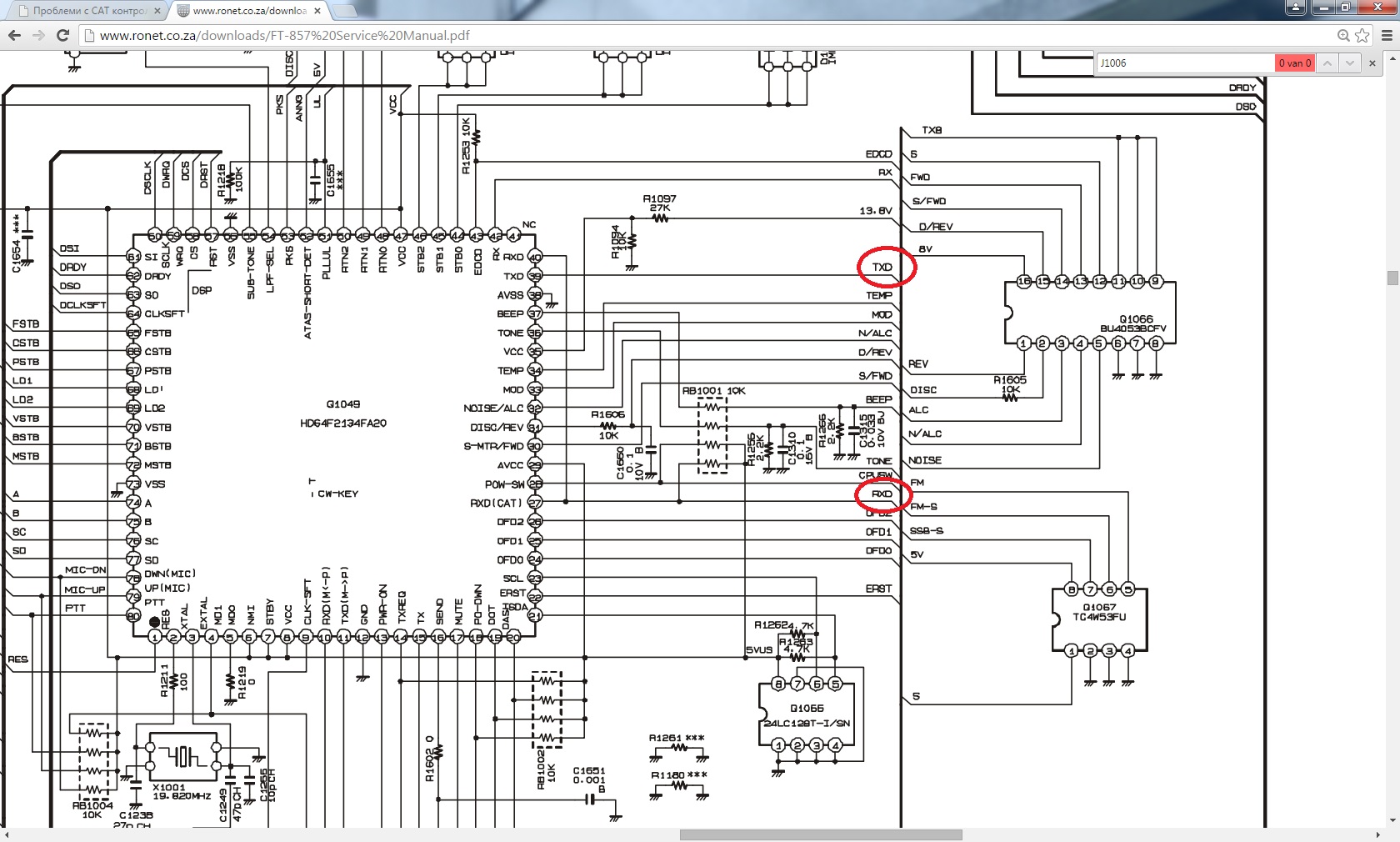 ако чипът е останал в състояние "BAND DATA", най-лесно е това да се установи, като се мернат нивата на пинове #4 и 5 спрямо #3, превключвайки бандове 30м и 40м. когато радиото е на първия от тях и двата бита би трябвало да са "L", а на втория банд - и двата "H". ако е така, можем да продължим с мерене и на другите два бита - пинове #6 и 7, и да търсим защо Q1049 се успива и не минава в режим на серийна конзола.