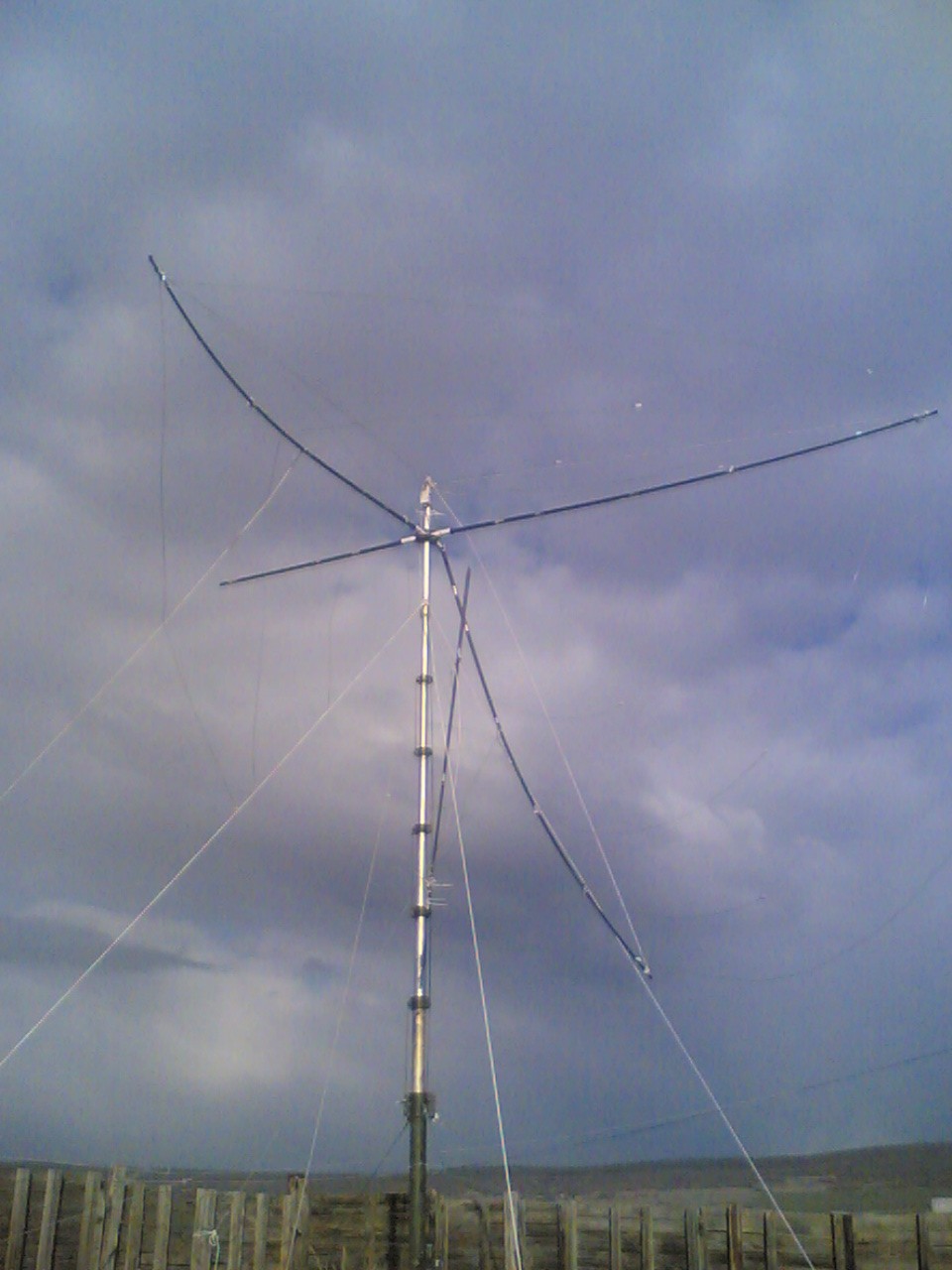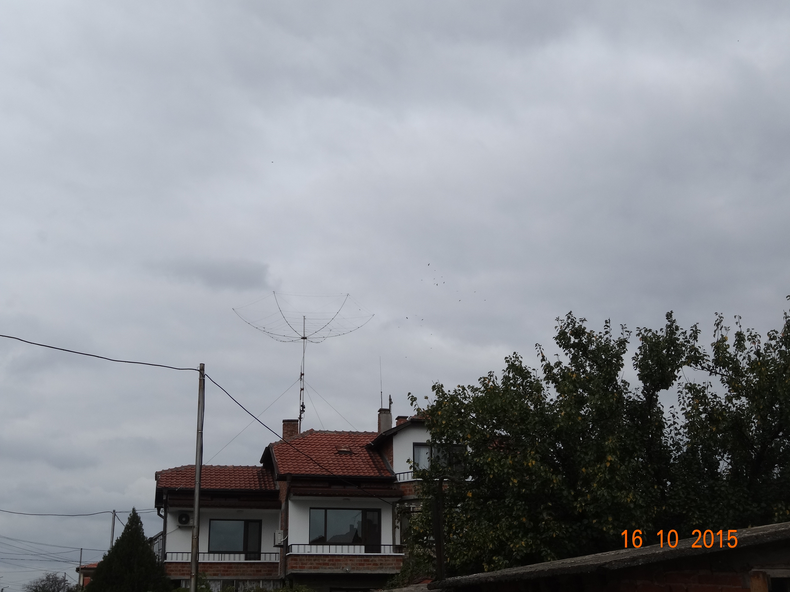 като си преместих радиото на село първоначалния вариант беше 5 бандов спайдърбим HD с добавка дипол на 10МХц по оста му, вертикал с капацитивна шапка за 3,5МХц и 3 жични сфазирани вертикала за 7МХц около него. После добавих една макара на мачтата на спайдъра, за да вдигам Inv Vee за 80м заради вътрешните състезания. Спайдъра е поставен върху G800SA без никакви лагери. От 2007г досега веднъж съм му боядисвал прътите, че се напука боята от слънцето.