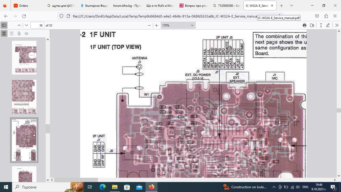 Може би е добре да разясня по подробно за какво става дума. Забелязах че последните две седмици трансивера "оглуша". Изкарах резервният и се оказа че айкома има проблем. След разклащане на антената проработи и пак спря. Разглобяването показа, че BNCто е разкачено. От платката стърчеше бяла тръбичка, подобна на изолация от кабел. Разпоих я и се опитах да я разширя за да вкарам в нея по дебел посребрен кабел при което я счупих. Запоих кабела без нея и сега всичко работи, но ми се струва че крайното стъпало пече повече от преди. Имате ли идея що за елемент може да съм поразил? По схемата не го виждам, освен ако не е един джъмпер отбелязан като W1 на платката 1F ?